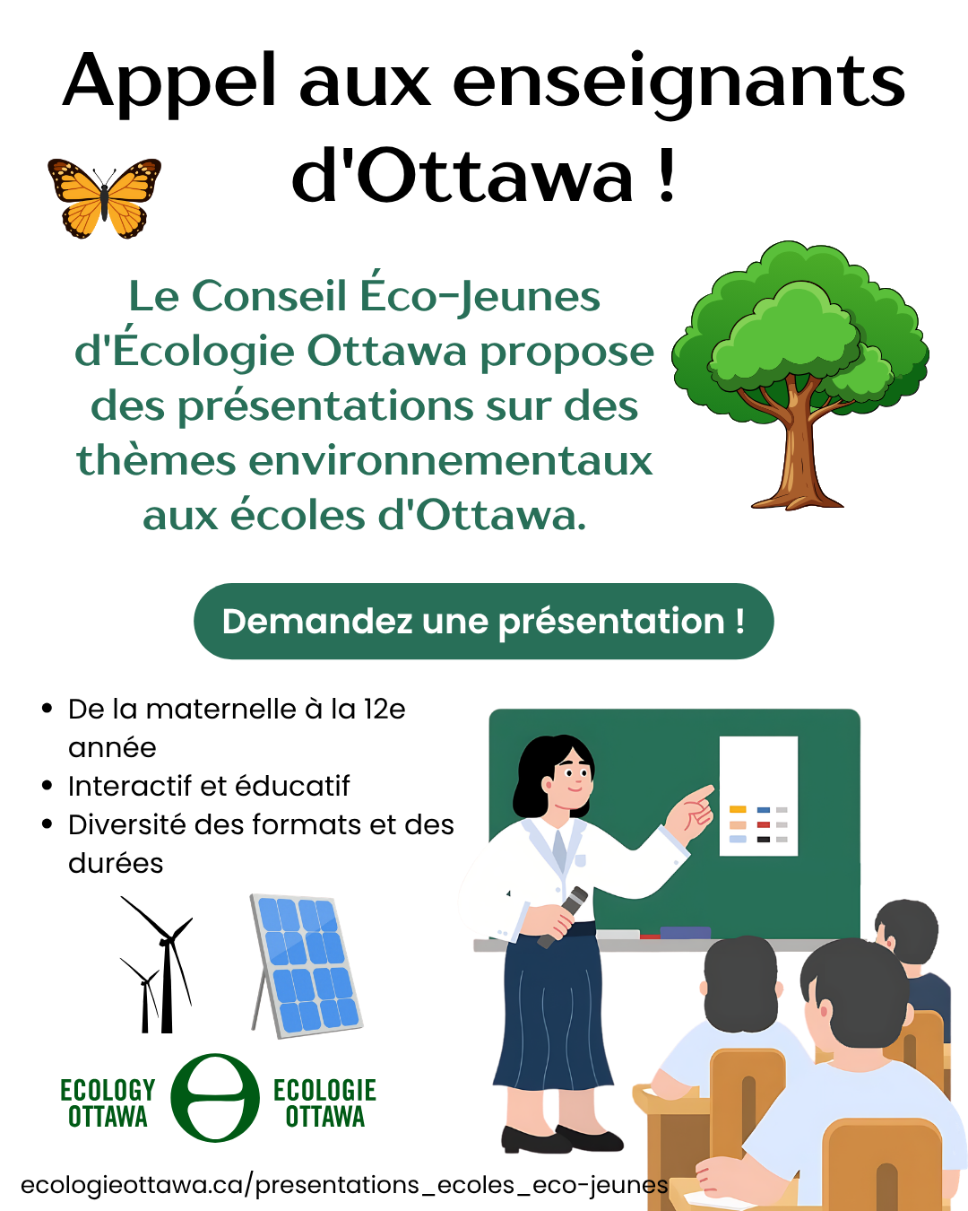 | Les papillons à Ottawa | 15 min | 1re et 2e années | 4 mai | Anglais | En personne | Civic hospital et Hintonburg |